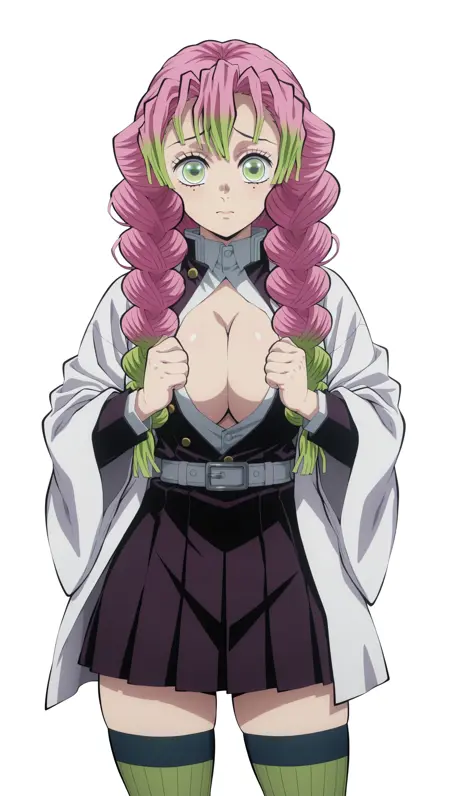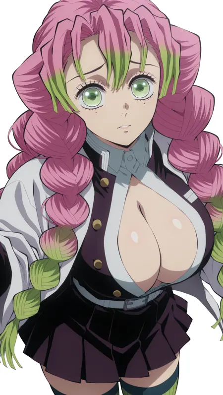 anime coloring, masterpiece, best quality, amazing quality, nkanroji, 1girl, long hair, gradient hair, tri braids, green eyes, mole under each eye, big breasts, haori, demon slayer uniform, belt, skirt, pleated skirt, ribbed thighhighs, cleavage, long sleeves, wide sleeves, solo, pose, standing, looking at viewer, white background, simple background