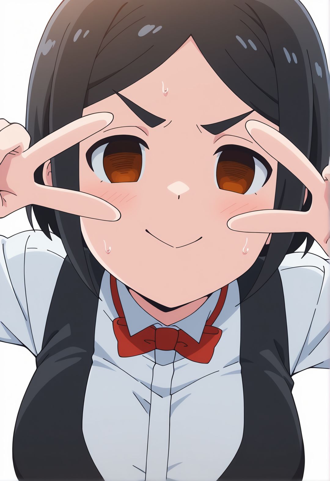 short hair, black hair, brown eyes, empty eyes, large breasts, parted bangs,