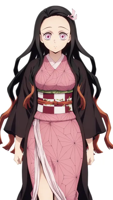애니메이션 컬러링, 걸작, 최고 품질, 놀라운 품질, 네즈코, 1소녀, 긴 머리, 그라디언트 머리, 분홍색 눈, 가로동공, 중간 크기 가슴, 헤어 리본, 하오리, 검은 하오리, 기모노, 분홍 기모노, 띠, 오비, 단독, 포즈, 서 있음, 보는 사람을 바라봄, 흰 배경, 단순한 배경