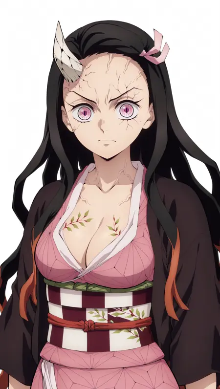 애니메이션 컬러링, 걸작, 최고 품질, 놀라운 품질, 네즈코, 1소녀, 긴 머리, 그라디언트 머리, 분홍색 눈, 가로동공, 중간 크기 가슴, 가슴 노출, 하오리, 검은 하오리, 기모노, 분홍 기모노, 띠, 오비, 바디페인팅, 송곳니, 분노 정맥, 단일 뿔, 균열된 피부, 단독, 포즈, 서 있음, 보는 사람을 바라봄, 흰 배경, 단순한 배경
