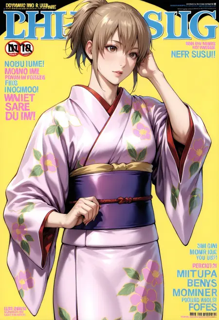 服装2: ponytail,japanese clothes,kimono,sash,obi,long sleeves,floral print,purple kimono,pink kimono,wide sleeves