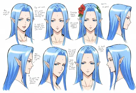 外观: KujakuHime_Kada,1girl,pointy ears,blue hair,long hair,hair flower,forehead mark