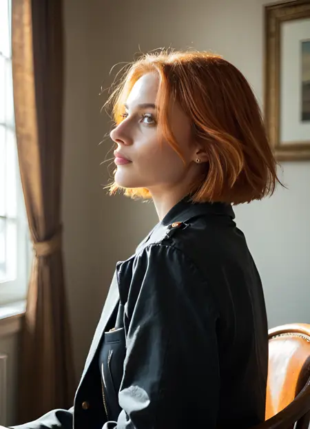ginger_style, 1girl, close-up, jaw-length bob, side view, black jacket, photorealistic생동감 있는 하이라이트: