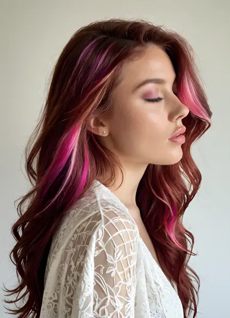 ginger_style, 1girl, raspberry highlights, pink highlights, long hair, white lace top