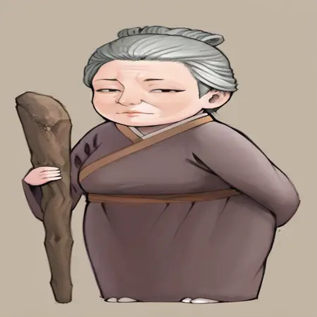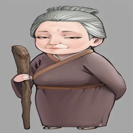 1girl, solo, holding, old woman, staff, grey hair, old, holding staff, fat, closed mouth, looking at viewer, half-closed eyes, short hair, dangsooru, dangsooru_clothes