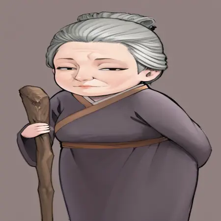 1Girl, solo, holding, old woman, staff, grey hair, old, holding staff, fat, closed mouth, looking at viewer, half-closed eyes, short hair, Dangsooru, Dangsooru_clothes