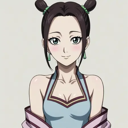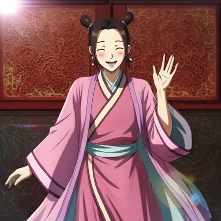 dark green eyes, meduim brown hair, chinese clothes, jewelry, earrings, kimono, hanfu, hair ornament, pink kimono, lipstick, makeup, short hair, hair bun, sidelocks, hair bobbles, pink lips,