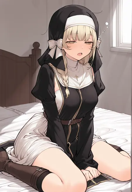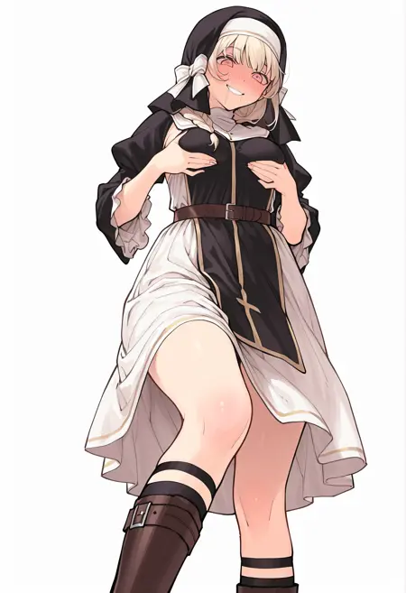 thistle_coffin, 노랑 눈, 중간 크기 가슴, 수녀, 드레스, 십자가 목걸이, 무릎 부츠,
