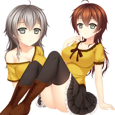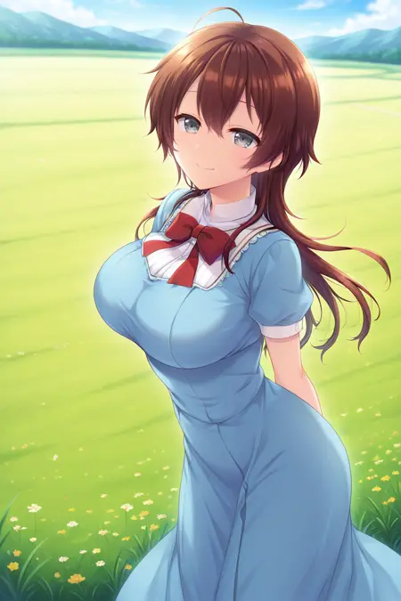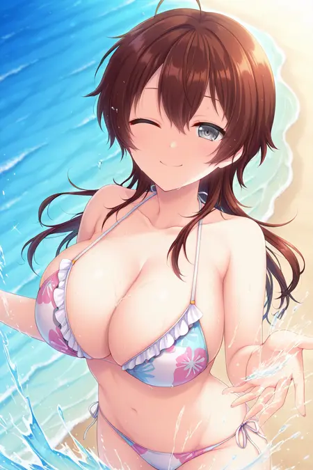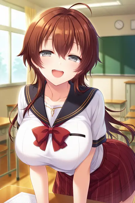 brown hair, long hair, bangs, hair between eyes, ahoge, grey eyes, large breasts,