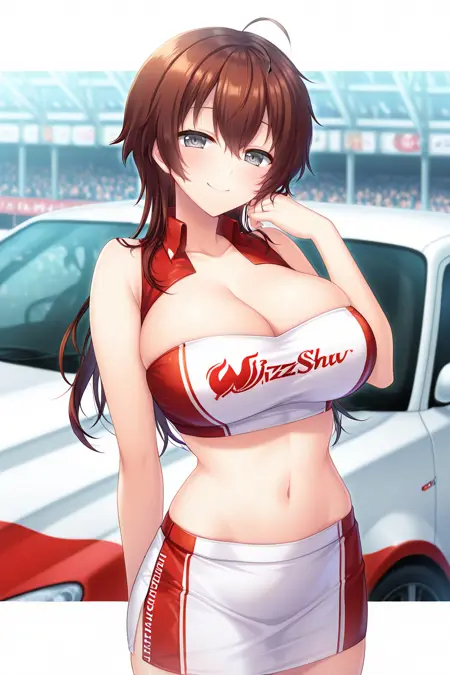 brown hair, long hair, bangs, hair between eyes, ahoge, grey eyes, large breasts,