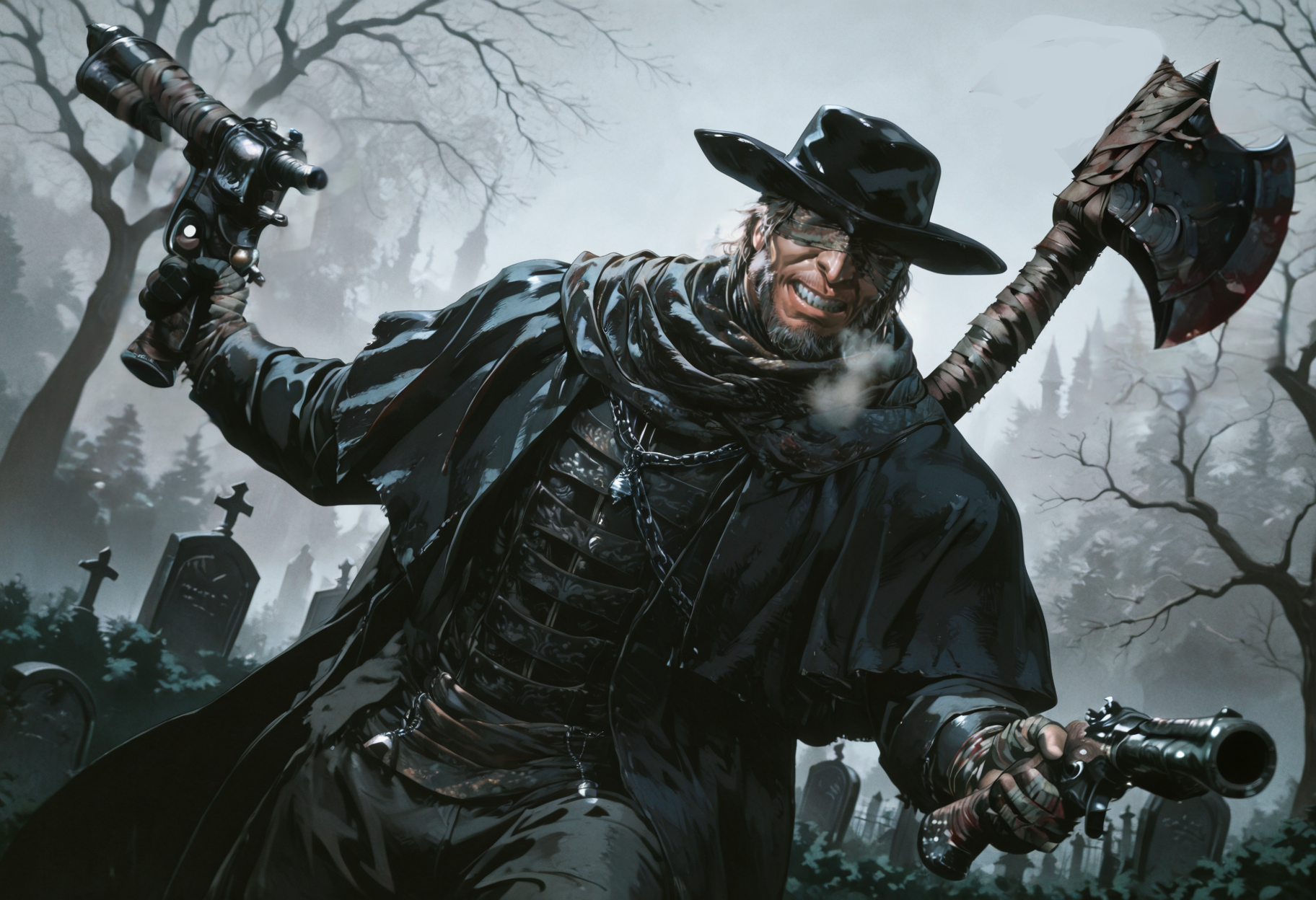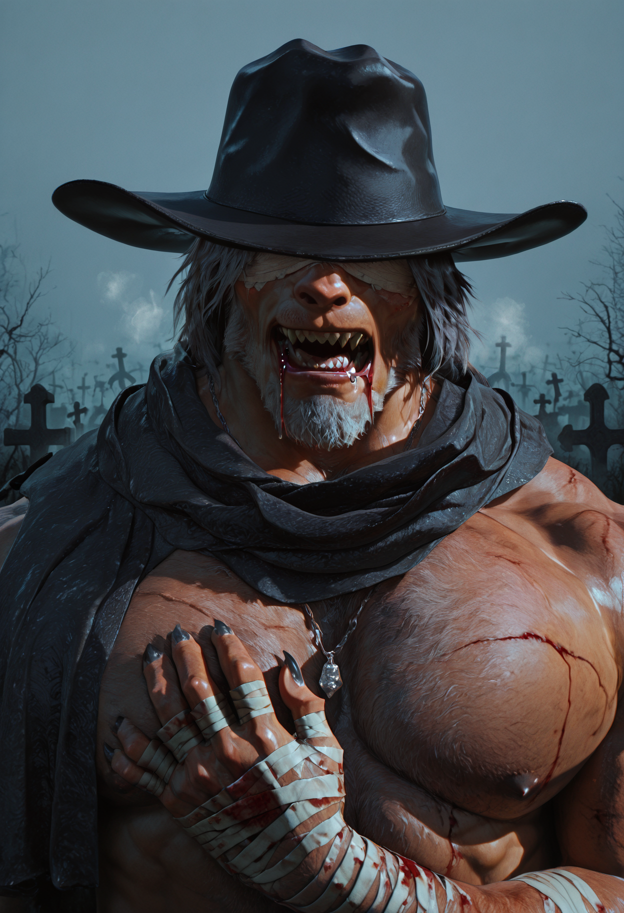fathergascoigne, 1boy, facial hair, hat, solo, bandages, blindfold, scarf, gloves, old man, necklace