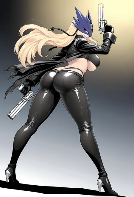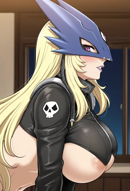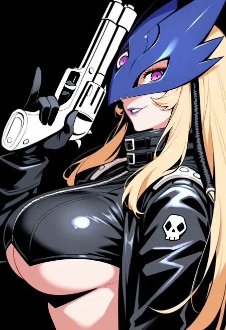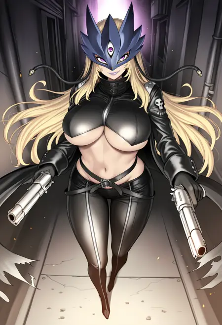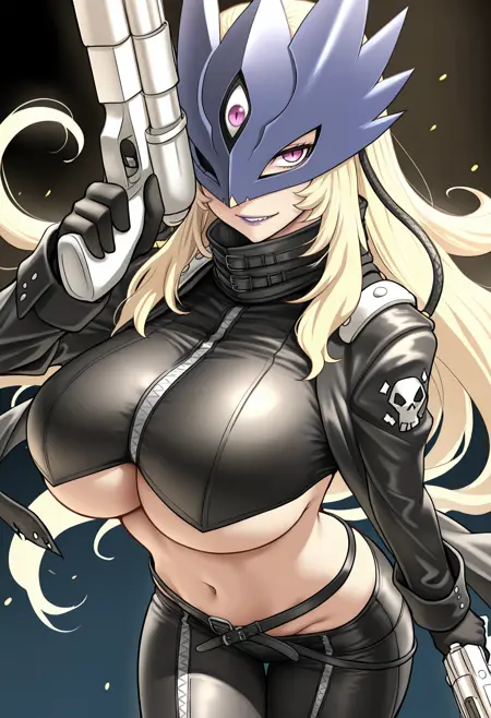 | 训练词汇 | b33lst4m0n, purple eyes, third eye, slit pupil, blonde hair, long hair, sidelocks, eye mask, purple mask, purple lipstick, tight clothes, black coat, open coat, torn coat, leather jacket, collared jacket, popped collar, belt collar, long sleeves, black gloves, black crop top, zipper top, midriff, underboob, large breasts, median furrow, navel, black belt, belt buckle, groin, zipper legwear, black pants, leather pants, high heel boots,已复制! |