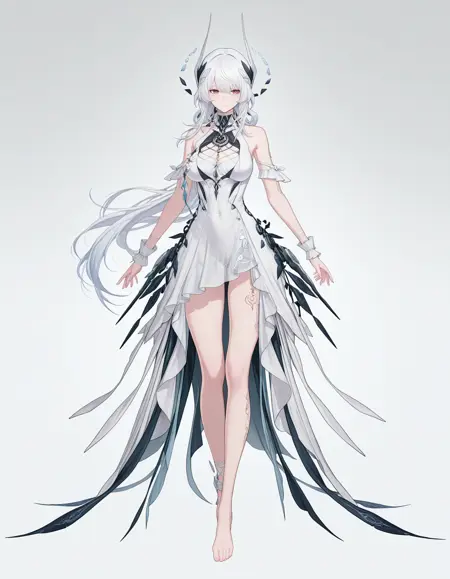 mai_pgr_liv_jm,very_long_hair,white_hair,red_eyes,headgear,white_dress,leg_tattoo,barefoot,floating_object