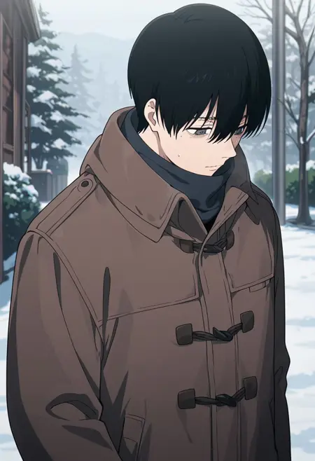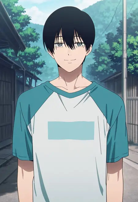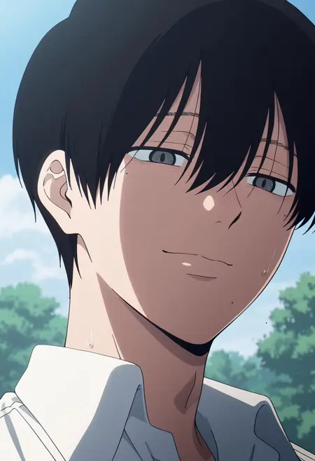 1boy, male focus, solo, grey eyes, black hair, school uniform, collarbone, white shirt, collared shirt, short sleeves, shirt tucked in, belt, black pants, sneakers,