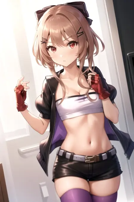 BernieDust, 1girl, solo, long hair, brown hair, x hair ornament, red eyes, purple thighhighs, fingerless gloves, navel, cleavage, black jacket, short sleeves, hair bow, short shorts, hairclip, midriff, belt, crop top, black bow, black shorts, short hair with long locks, red gloves, cropped jacket, bandeau, tube top, micro shorts