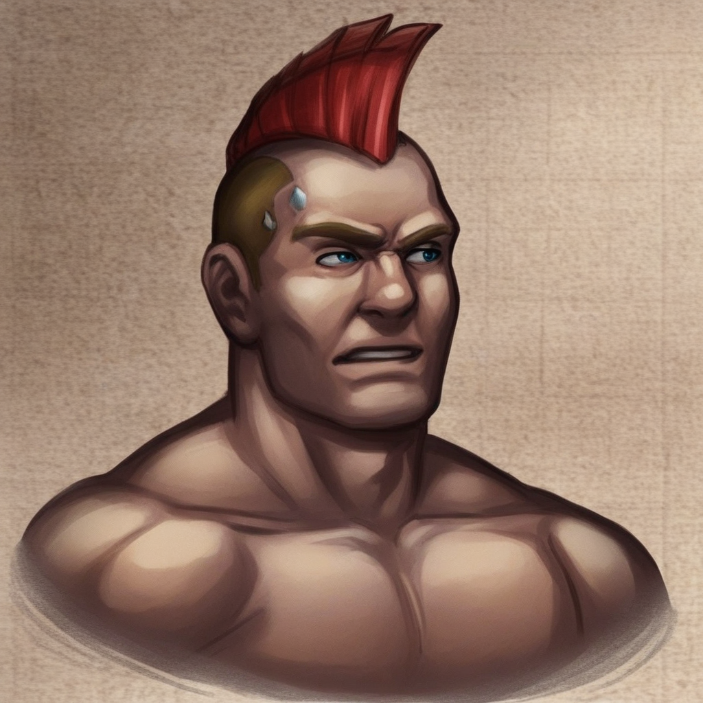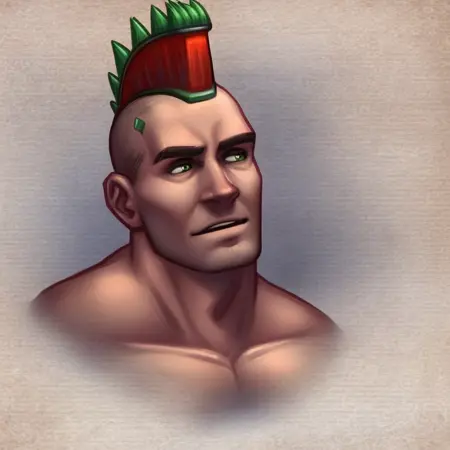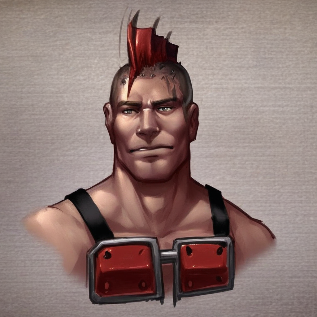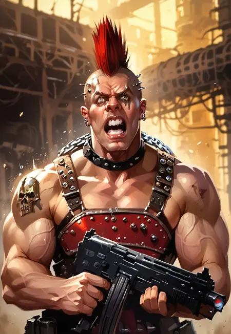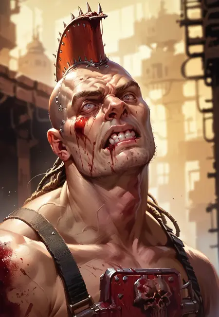 힘 1을 중심으로 작업. 트리거 - g0li4th_style - 이 전체적인 효과를 이끌어내야 하며, 다음을 추가: 모하awk, 갑옷, 피어싱, 체인, 하네스, 극도로 근육질,