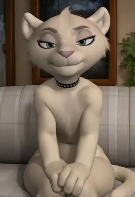 sierra, lioness, 3D, pink nose, cat, no humans, choker, green eyes, white fur, eyelashes, female, furry, anthro, round ears, whiskers, eyebrows, collar, twink,