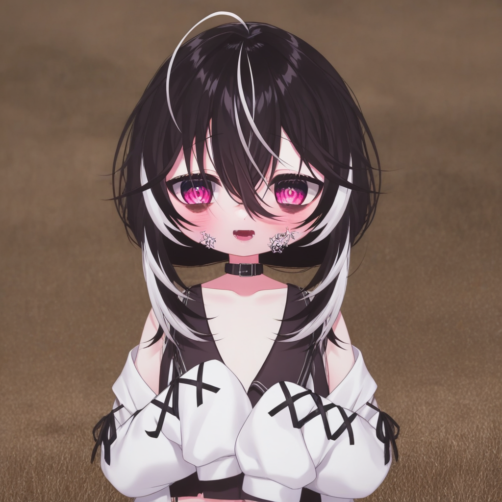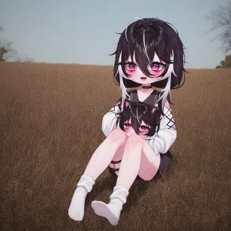 1girl, solo, long hair, looking at viewer, blush, smile, bangs, shirt, black hair, long sleeves, hair between eyes, purple eyes, white hair, multicolored hair, outdoors, sky, virtual youtuber, streaked hair, sleeves past wrists, night, star \(sky\), night sky, hair over shoulder, sleeves past fingers