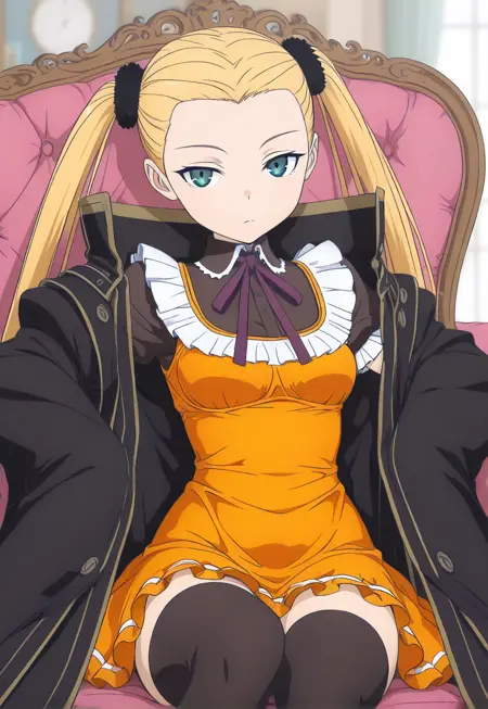 ・深棕色上衣,橙色裙子,蓬松袖子,短袖,紫色颈带,腰带,黑色过膝袜,黑色高跟鞋