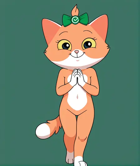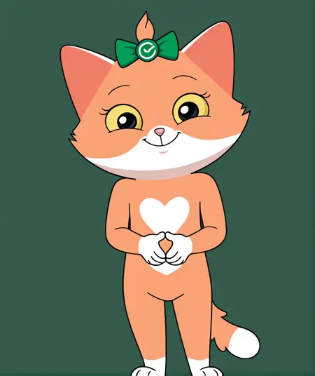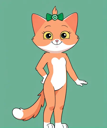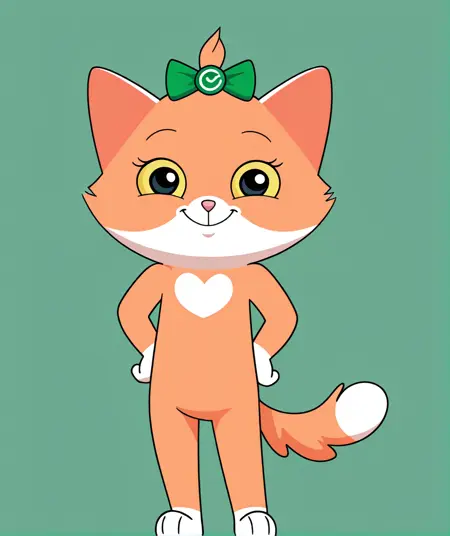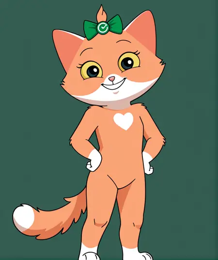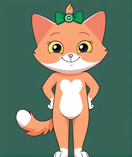 SberKusya, cat, furry, furry female, orange fur, two tone fur, green bow tie, yellow sclera, black eyes, tail, cat tail