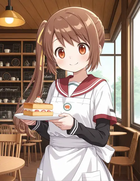 겨울 복장: mgrctsurunoyui, tsrwtr, 흰 머리핀, 빨간 털 장식이 있는 커텐, 핑크색 블라우스, 갈색 손가락 없는 팔 보호대, 검정색 느슨한 벨트, 갈색 주름 치마, 검정색 히어 스타킹