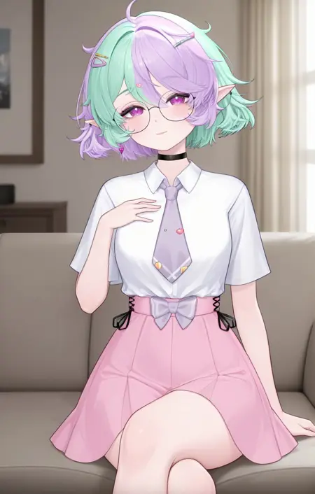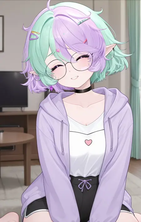 klmmox, short hair, hair between eyes, purple eyes, pink hair, purple hair, multicolored hair, green hair, glasses, pointy ears, hairclip, two-tone hair, eyelashes, earrings, ear clip, light smile, light blush, black choker, bob cut, ear piercing, gem, heart hair ornament