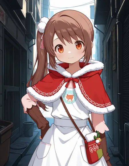 配達の衣装: mgrctsuruoutfits, tmodlv, 茶色の髪, 片側ポニーテール, オレンジの瞳, 白い髪止め, 赤いファー trimming付きキャップレット, ピンクのブラウス, 茶色のフィンガーレスアームウォーマー, 白いエプロン, 赤いファー trimming付きショルダーバッグ, 黒いレッグウォーマー
