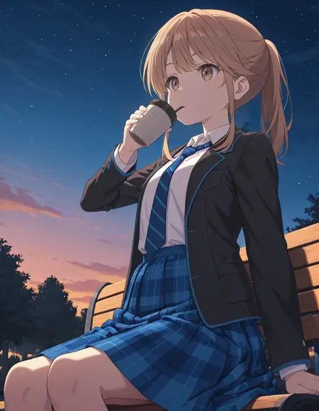 학교 유니폼, 검정 재킷, 흰색 칼라 셔츠, 파란 넥타이, 줄무늬 넥타이, 긴 소매, 파란 치마, 주름치마, 체크무늬 치마, 흰색 양말, 운동화