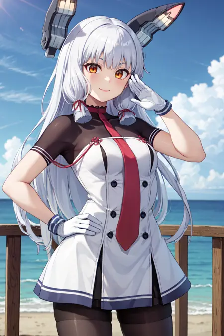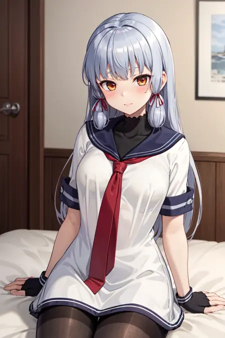 • aamurakumo,头饰,橙色眼睛,长发,发带,红色领结,水手领,(白色连衣裙:1.2),(白色水手服:1.2),短袖,黑色露指手套,黑色连裤袜,鞋子