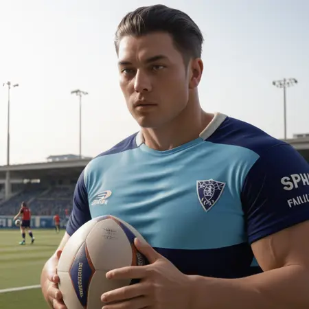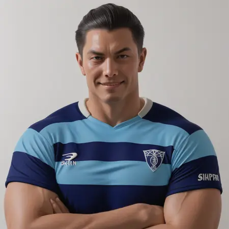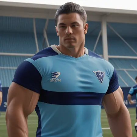 외모: 스포츠웨어, 축구 유니폼, 줄무늬 셔츠, 저지, 손목 밴드, 파란 셔츠, 흰 색 반바지, 반바지