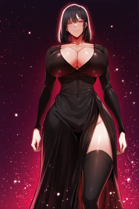 Ariela_outfit2, black dress, long sleeves, cleavage, long skirt, side slits, black thighhighs, black heels,