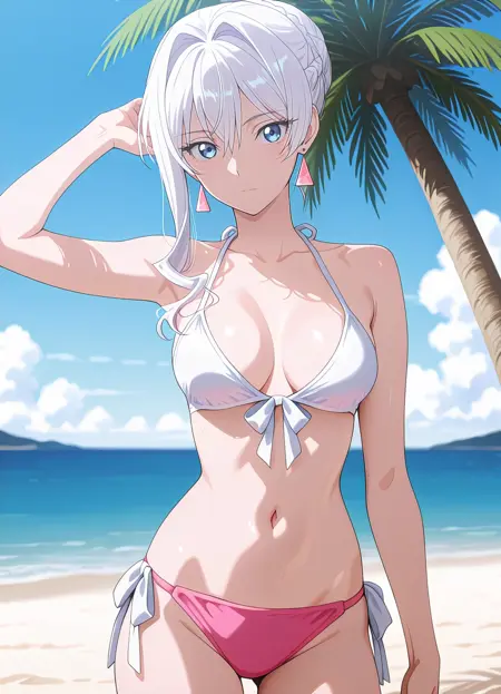 1girl, solo, white hair, long hair, hair intakes, hair between eyes, single sidelock, single hair bun, braided bun, crown braid, blue eyes, triangle earrings, medium breasts