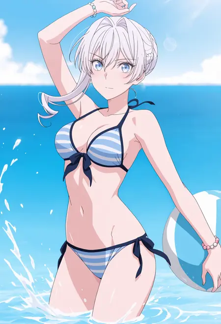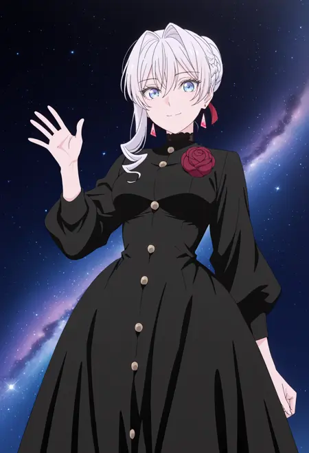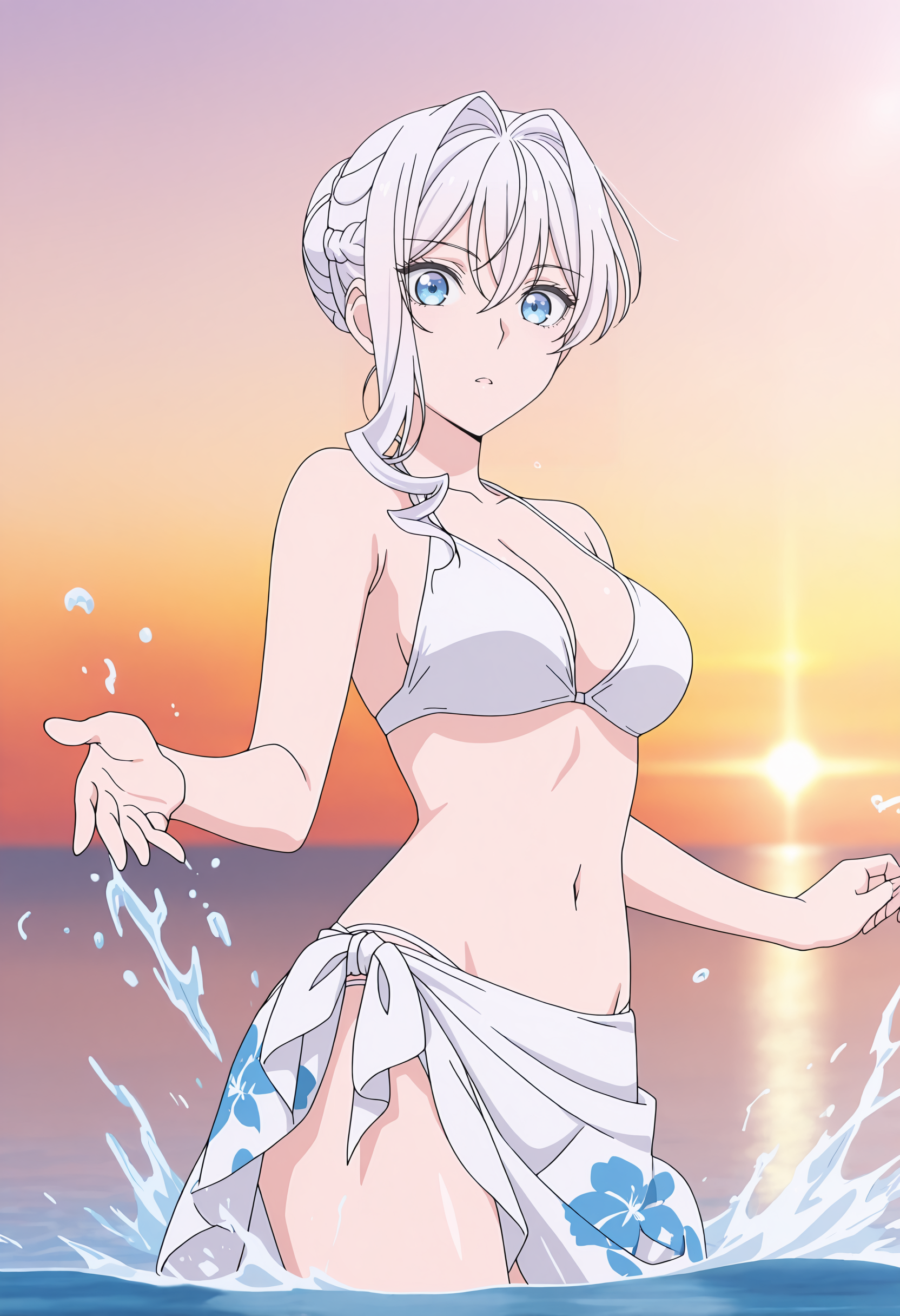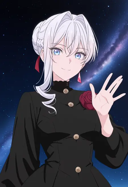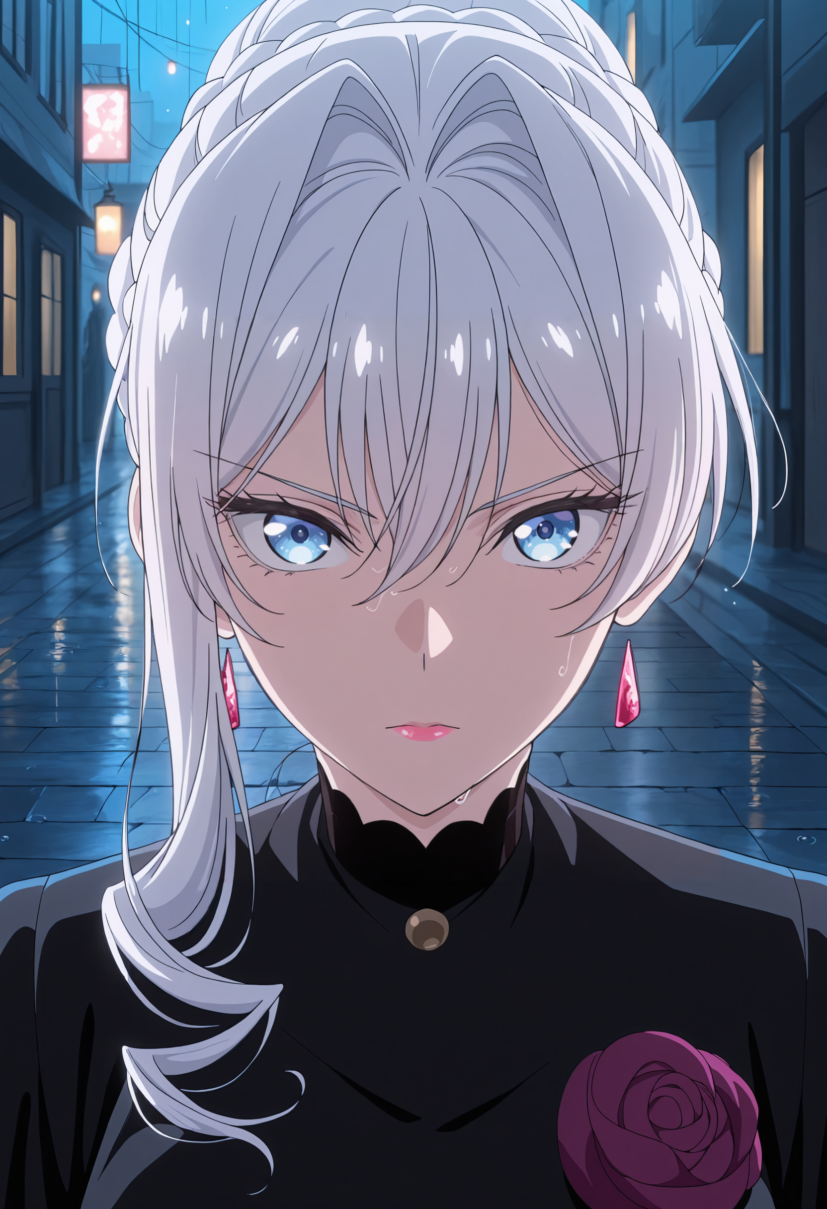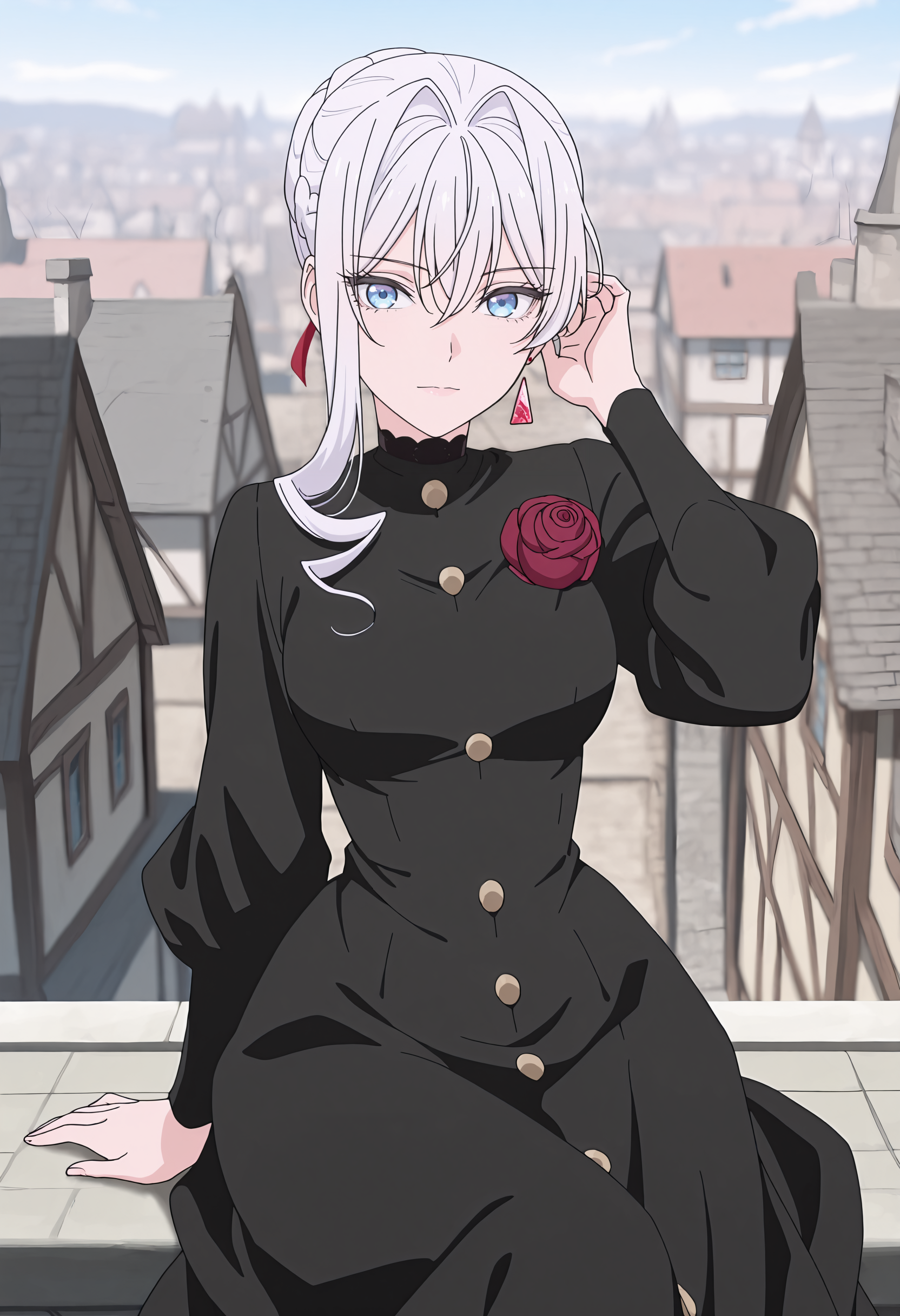 1girl, solo, white hair, long hair, hair intakes, hair between eyes, single sidelock, single hair bun, braided bun, crown braid, blue eyes, medium breasts