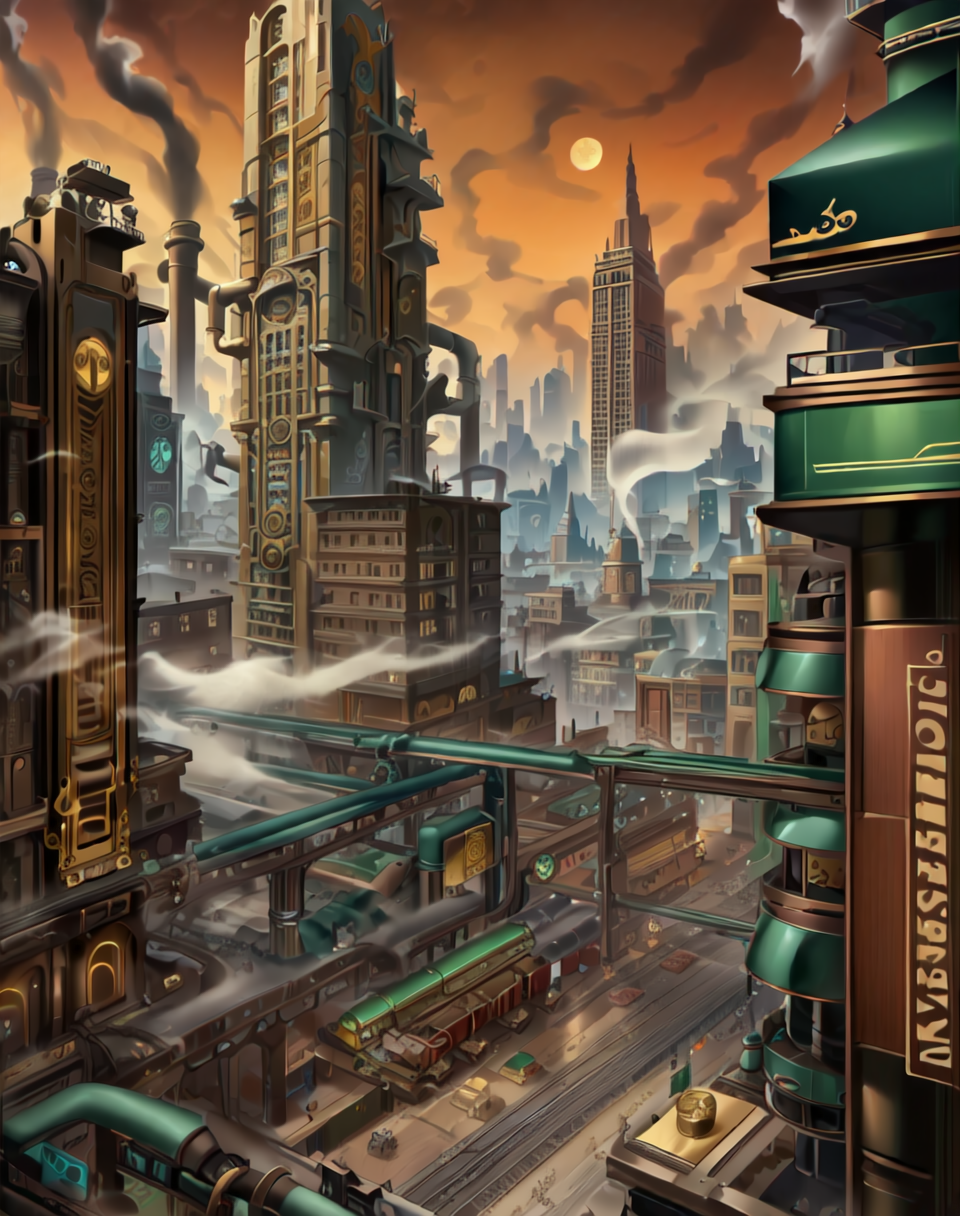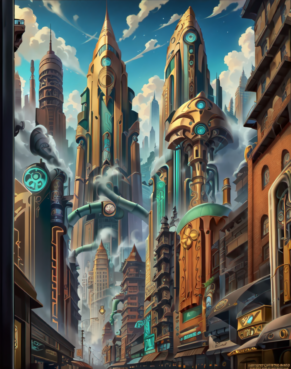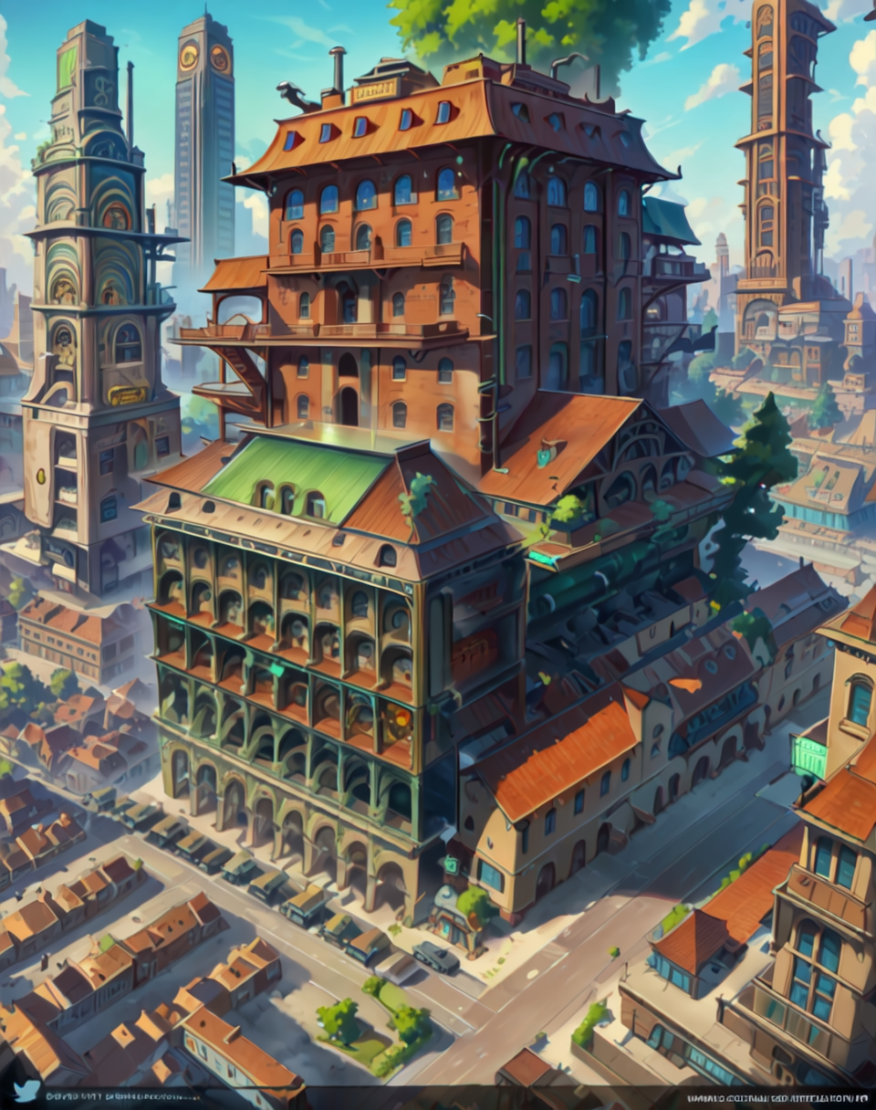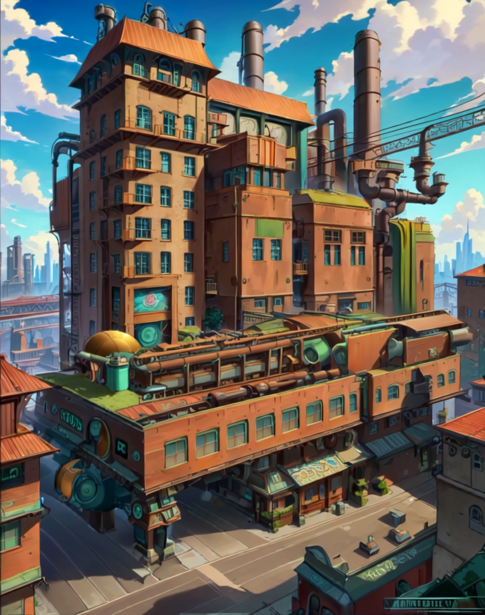 このLoRAのプロンプトは(Dieselpunk、建築、)です。建物の外側や街全体に配管が描かれますが、配管というプロンプトを単独で使用すると、ほとんどのチェックポイントが配管しか描かない画像を生成するため、配管には重みをつけてプロンプトに含めてください。