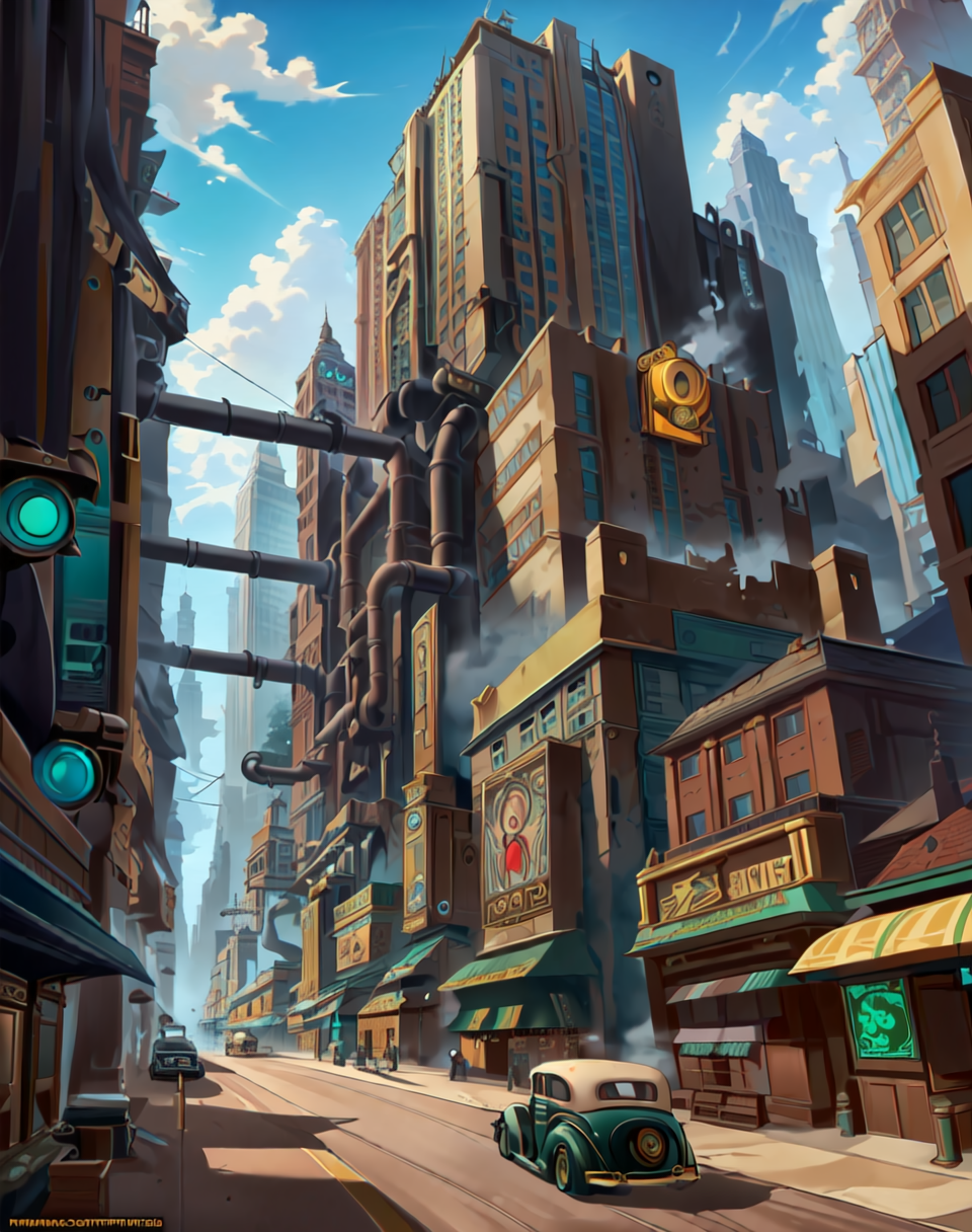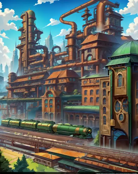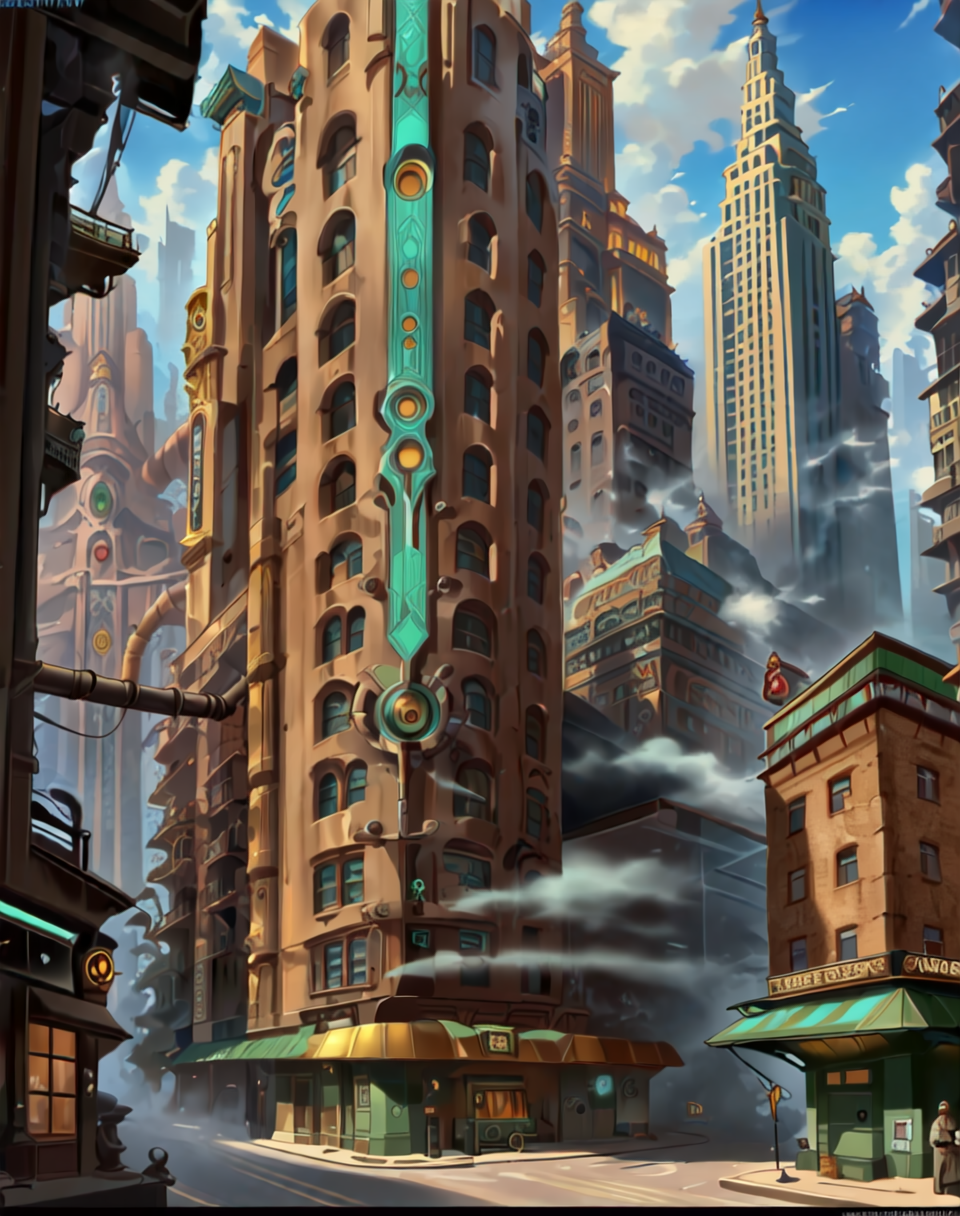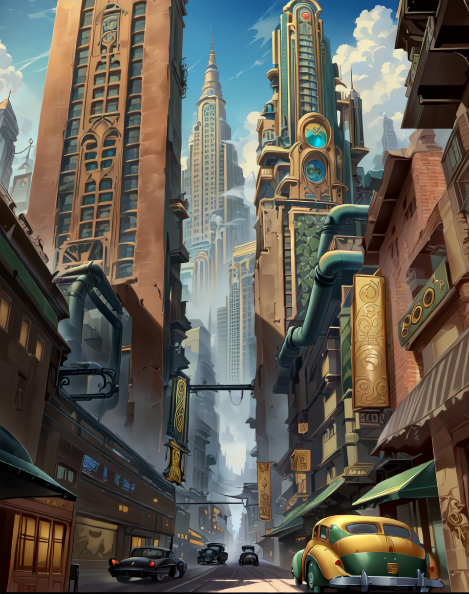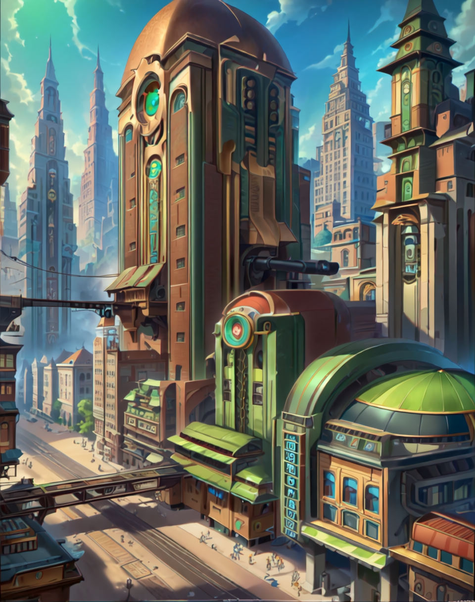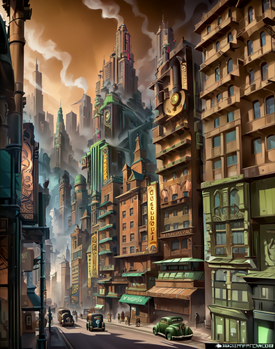 このLoRAのプロンプトは(Dieselpunk、建築、)です。建物の外側や街全体に配管が描かれますが、配管というプロンプトを単独で使用すると、ほとんどのチェックポイントが配管しか描かない画像を生成するため、配管には重みをつけてプロンプトに含めてください。