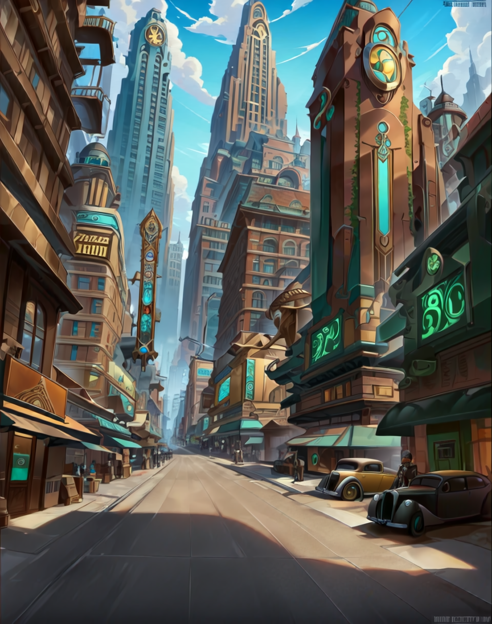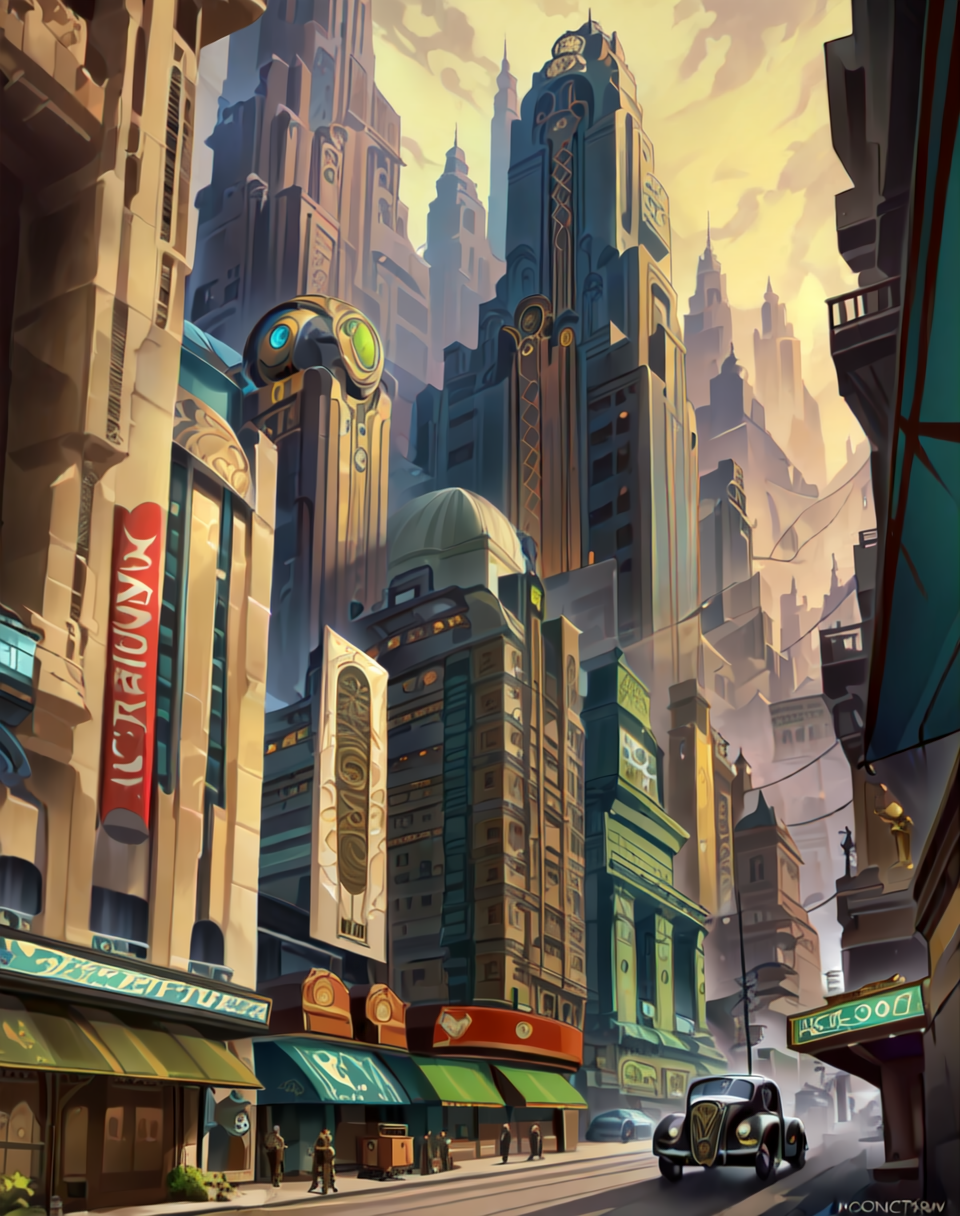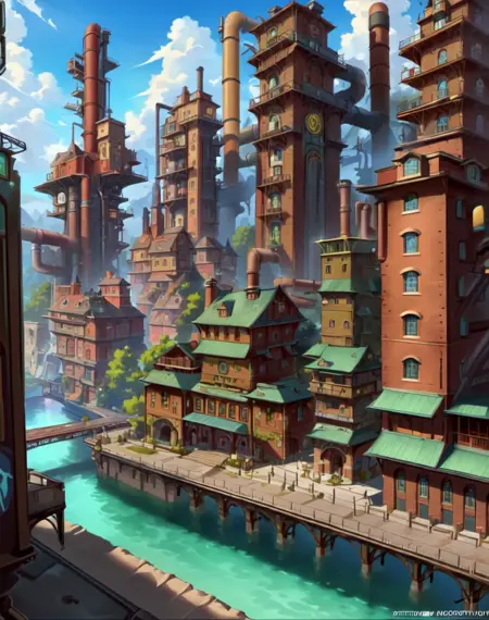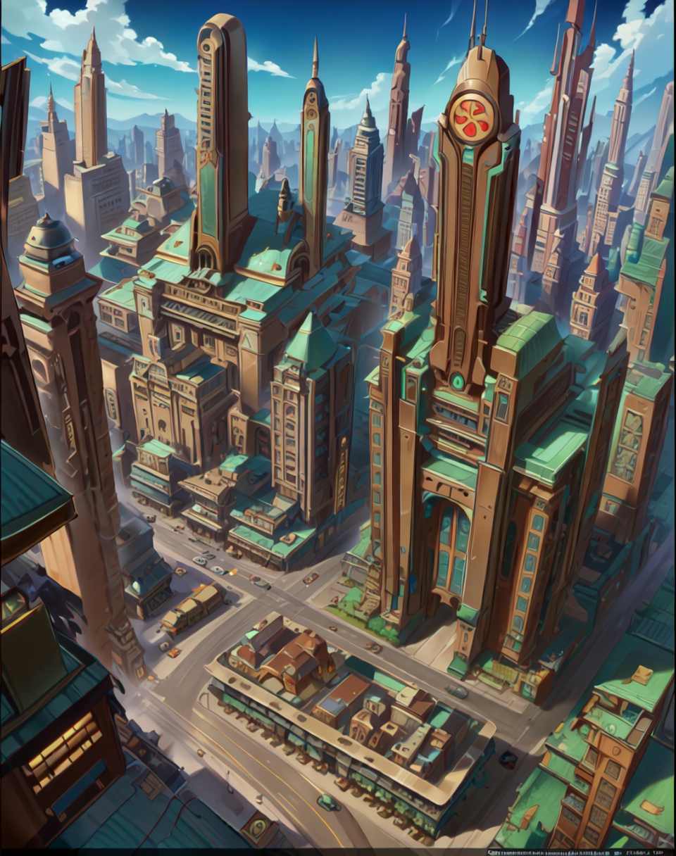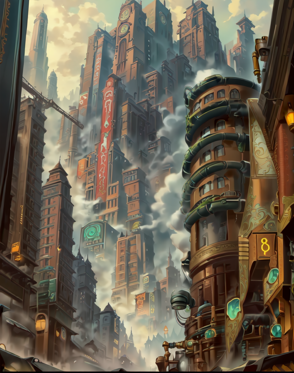 このLoRAのプロンプトは(Dieselpunk、建築、)です。建物の外側や街全体に配管が描かれますが、配管というプロンプトを単独で使用すると、ほとんどのチェックポイントが配管しか描かない画像を生成するため、配管には重みをつけてプロンプトに含めてください。