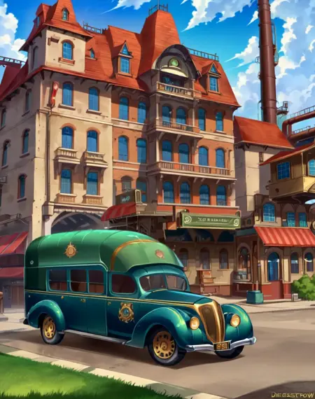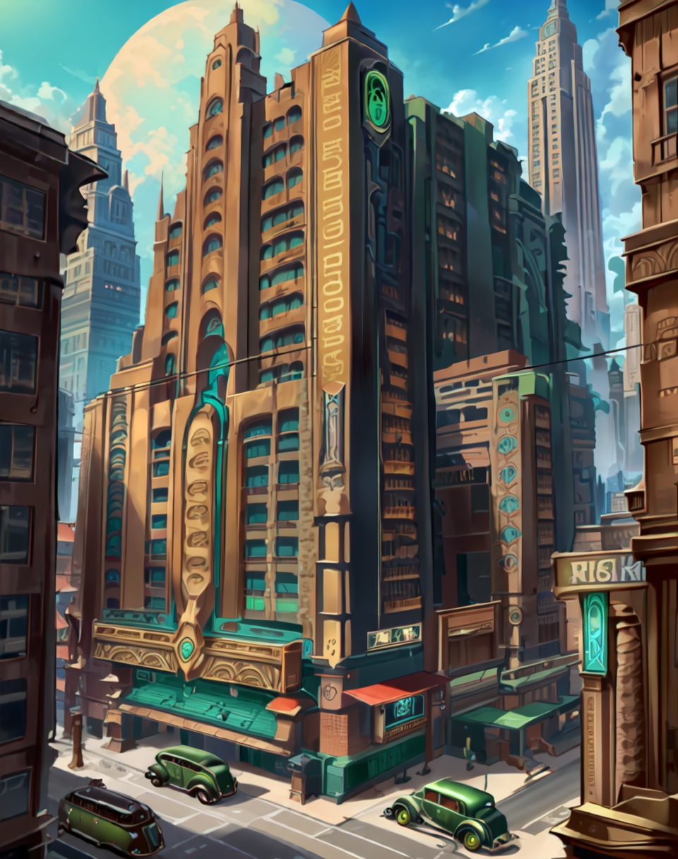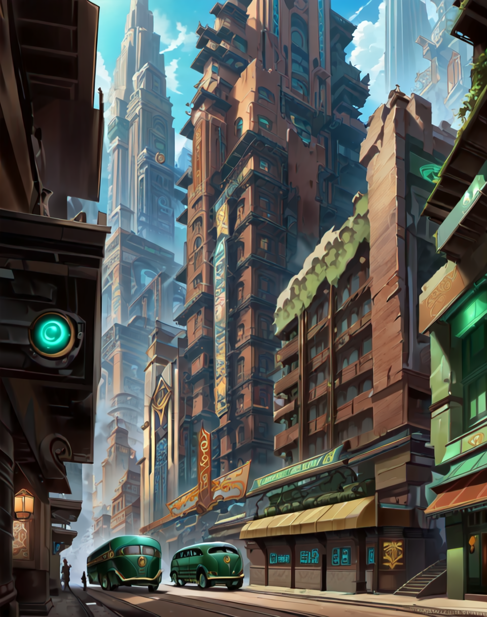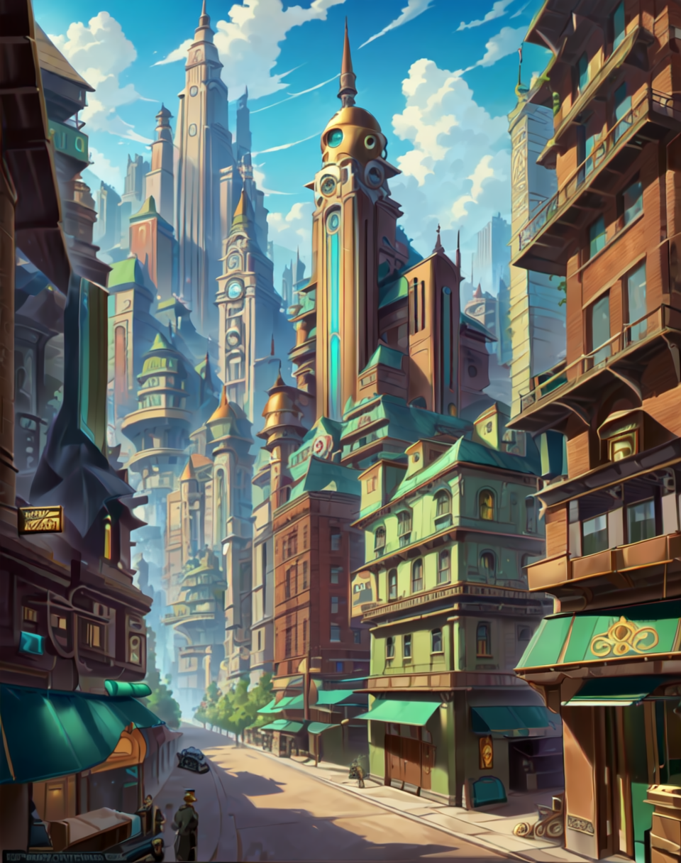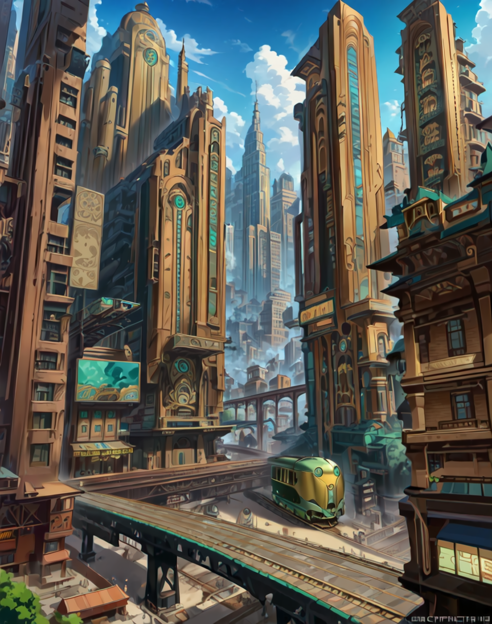 このLoRAのプロンプトは(Dieselpunk、建築、)です。建物の外側や街全体に配管が描かれますが、配管というプロンプトを単独で使用すると、ほとんどのチェックポイントが配管しか描かない画像を生成するため、配管には重みをつけてプロンプトに含めてください。