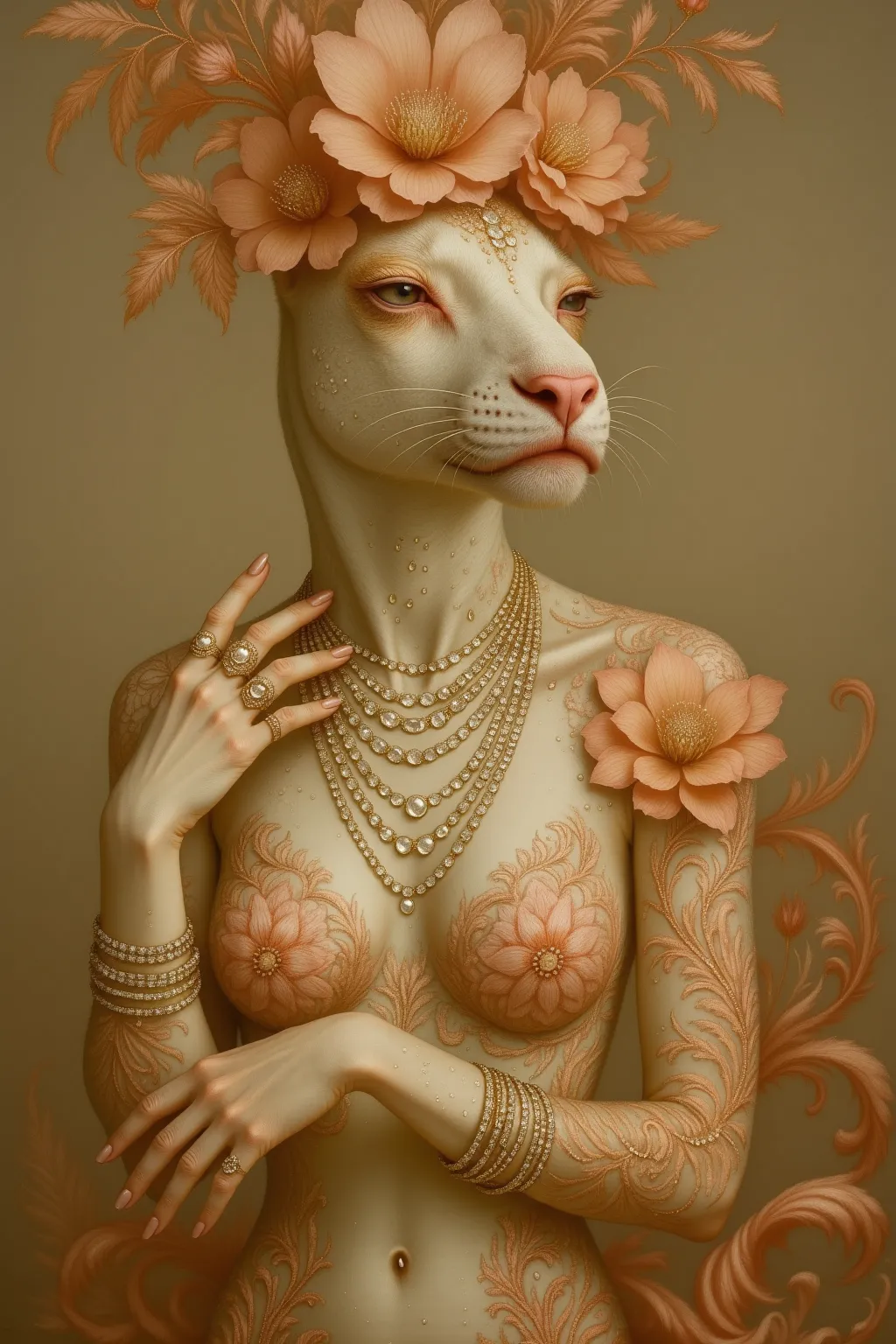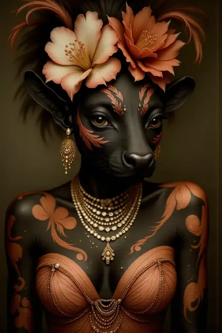 Just use prompts like:a gorgeous white female [ANIMAL] π―π€, covered in sparkling gold jewelry πβ¨, fashion model pose, hyper-detailed, dreamy background, Opulent Menagerie Style