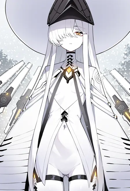 캐릭터: 1girl, malkuth \(blue archive\), 노란 눈, X자 모양의 동공, 기호 모양의 동공, 색깔 있는 피부, 하얀 피부, 하얀 머리카락, 한쪽 눈을 가린 머리카락, 매우 긴 머리카락, 측면 머리카락, 눈 사이의 머리카락, 노란 하늘색 고리, 작은 가슴