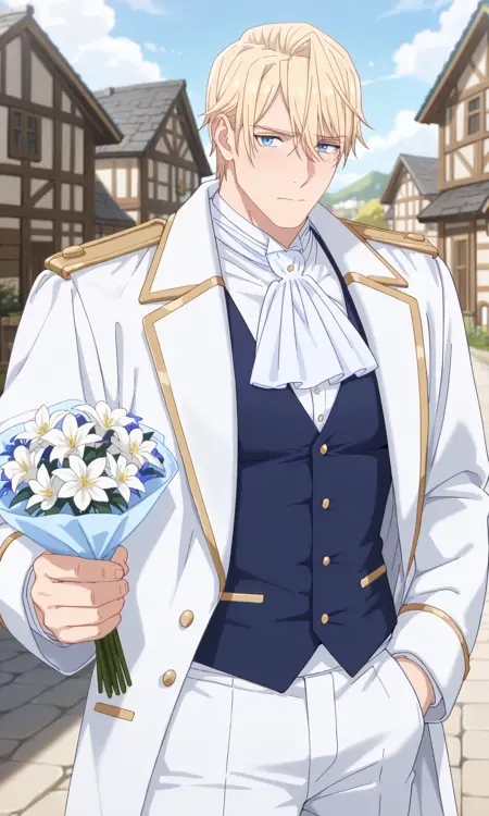 Seccond outifit: noble uniform,small epaulets,white tailored coat,gold trim,dark navy-blue vest buttoned up,white shirt under,flowing white cravat, white pants,dark navy-blue boots,