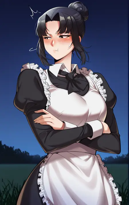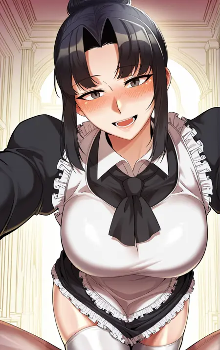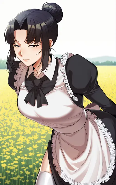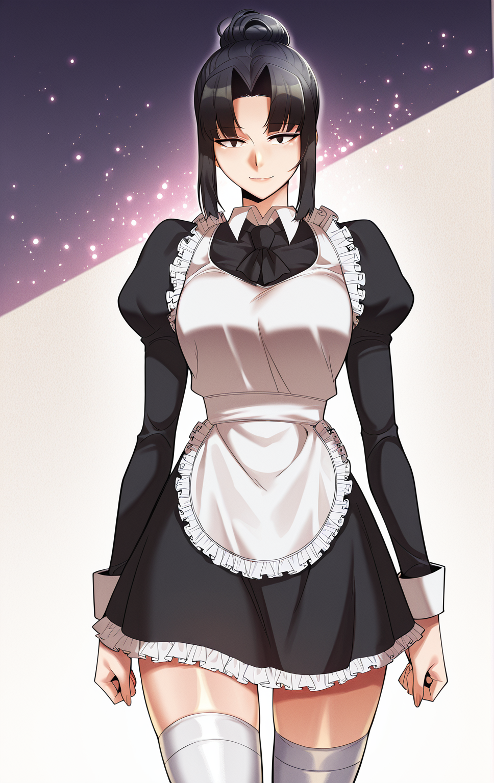 Heoseung,1个女孩,单独,棕色眼睛,黑发,齐刘海,分刘海,发髻,高发髻,侧发,
