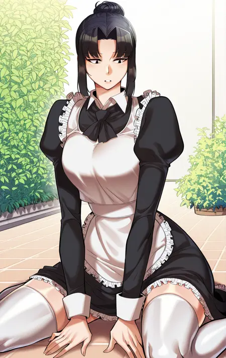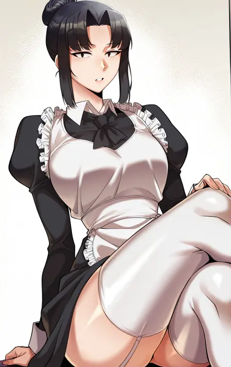 Heoseung_服装,女仆装,黑色连衣裙,长袖,蓬松袖子,白色围裙,花边围裙,系带,黑色颈带,白色长筒袜,玛丽珍鞋,