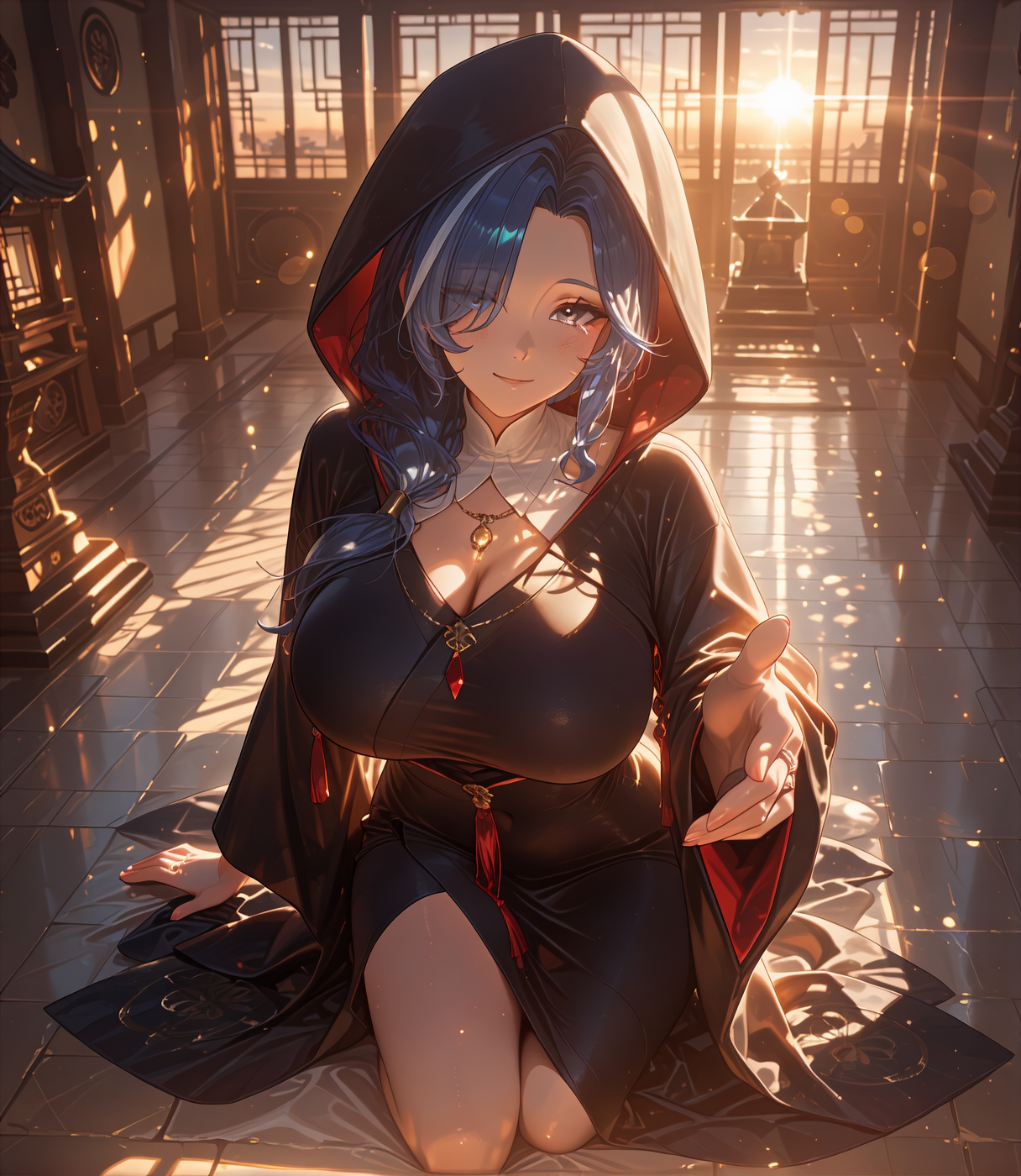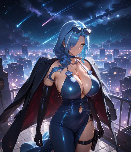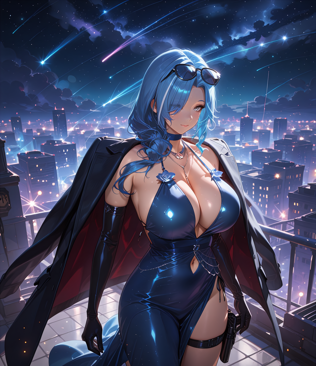 H3ldr3ss、グレーの瞳、青髪、片目にかかる髪、ストライプ入り髪、ロングヘア、分け目のある前髪、肩にかかる髪、巨乳、胸元の露出、青いチョーカー、青いイブニングドレス、ハルターネック、おへそ開き、肩の露出、シルバーネックレス、肘まで覆う手袋、サイドスリット、白いサイドタイパンツ、花のアクセサリー、青い花、太ももホルスター、青い太ももストラップ、シルバーハイヒール、肩にかけたコート、黒いコート、拳銃、眼鏡を頭に載せた状態