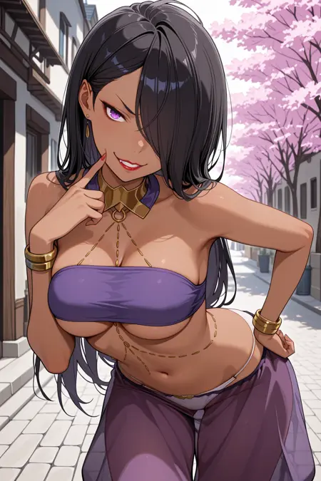 珠宝, 手镯, 金手镯, 环形物, 颈环, 哈伦裤装, 紫色胸衣, 肚脐, 下胸, 白色内裤, 内衣, 紫色长裤, 宽松长裤, 透明衣物, 透明长裤