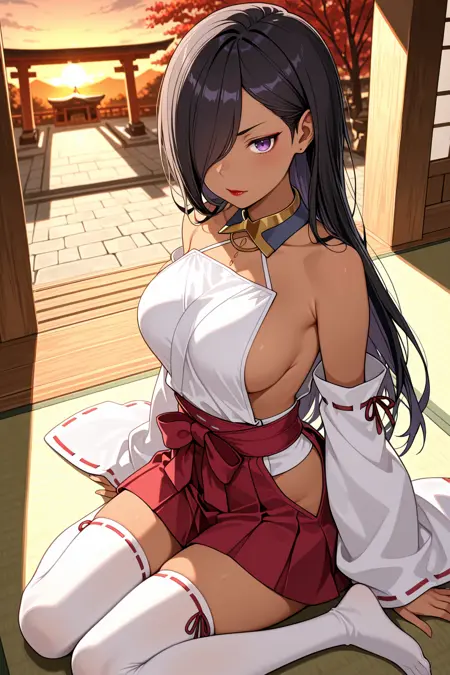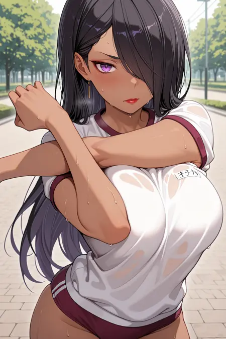 aisha belka, 深色肤色女性, 黑色头发, 长发, 头发遮住一只眼睛, 紫色眼睛, 红唇
