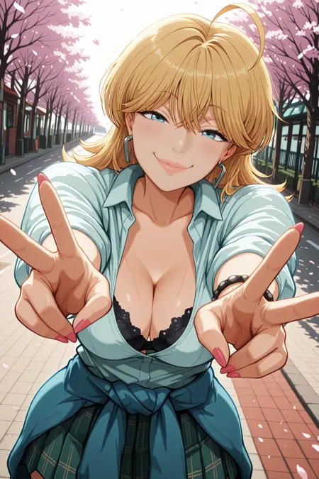 christine (lazarus), blue eyes, lips, blonde hair, earrings, ahoge