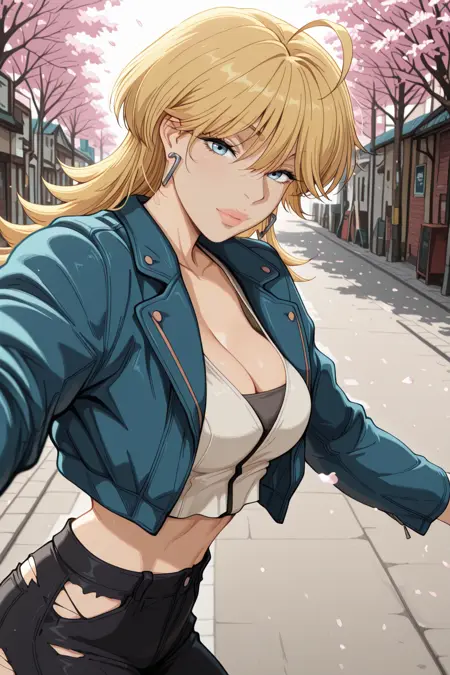 blue jacket, white crop top, cleavage, long sleeves, black pants, midriff, torn pants, torn jeans, brown boots