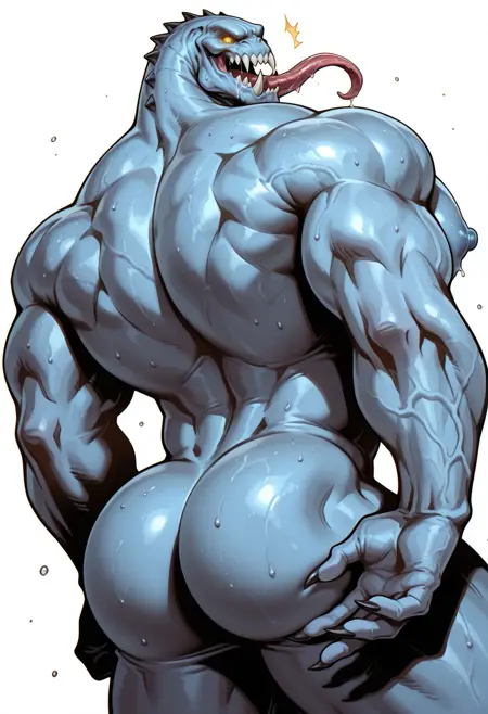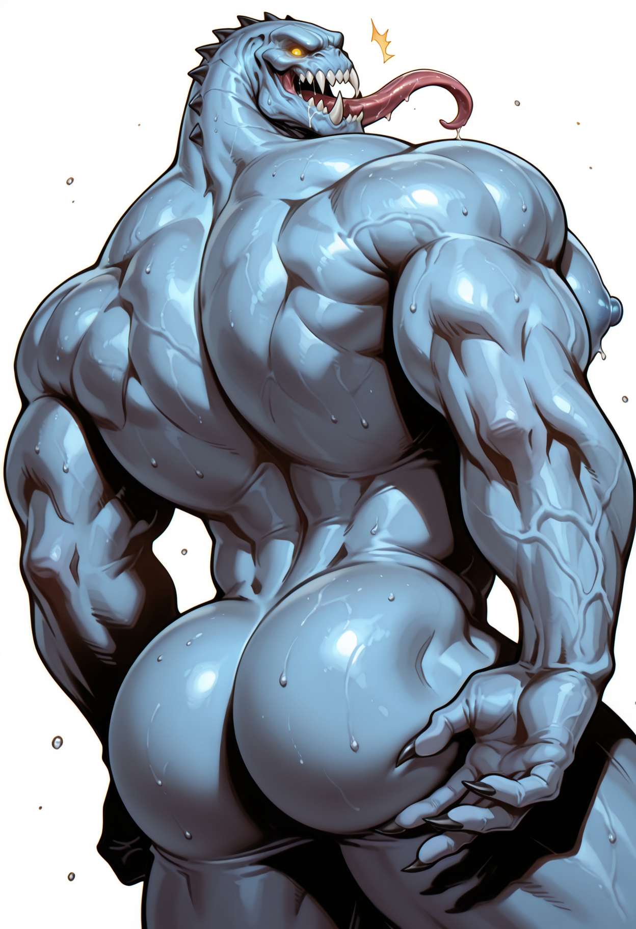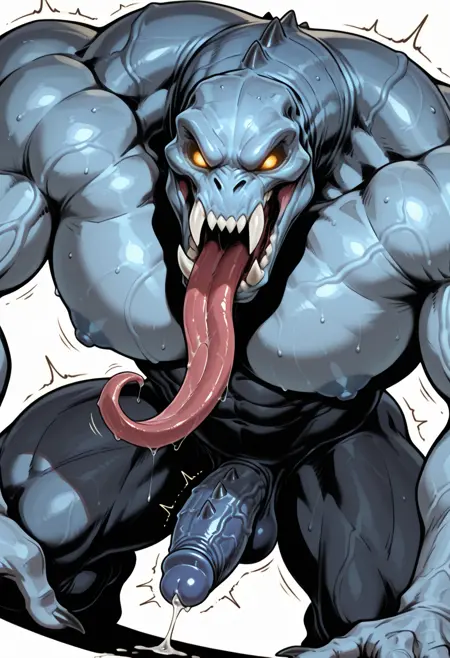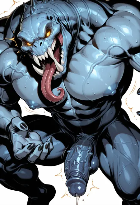 Arkillo, monster, glowing eyes, sharp teeth, long tongue, blue skin, black claws, Blue nipples, Blue penis,