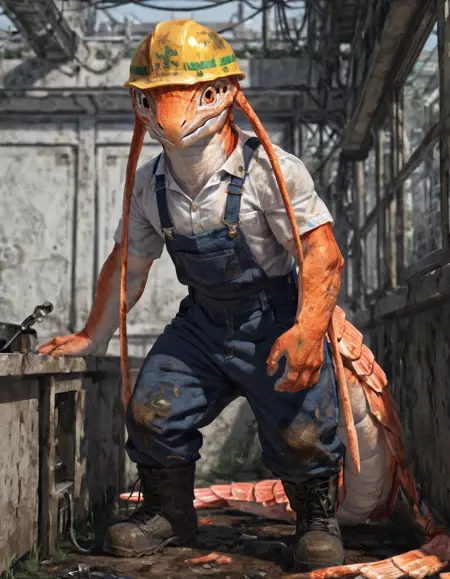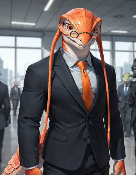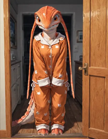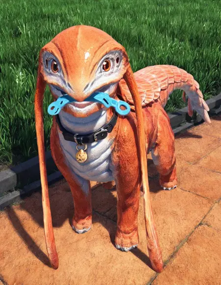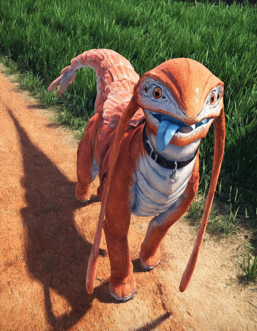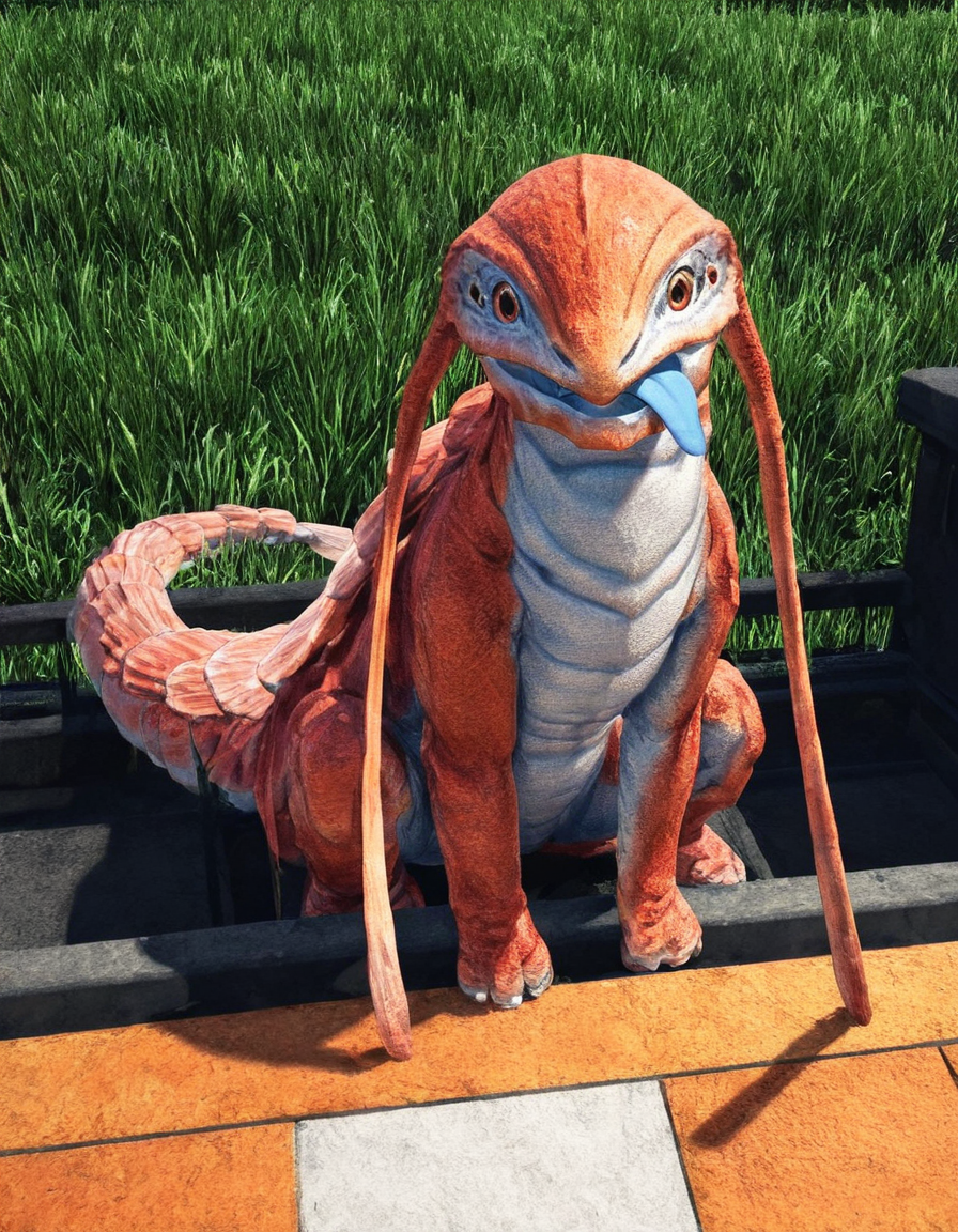 lizarddoggo, lizard, feral, four eyes, lobster tail, orange and white body, orange eyes, no humans, sitting, looking at viewer, blue tongue, tongue out