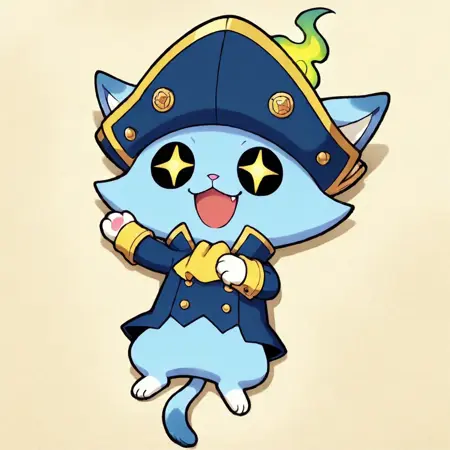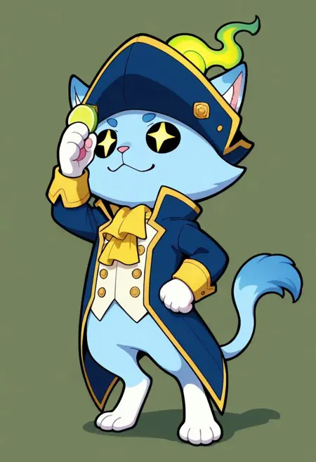 Solo,male,anthro cat,chibi,light-blue fur,black sclera,yellow stars pupils,pink nose,white paws,cat tail,dark-blue colonial sailor outfit,bicorn with golden trimmed and buttons,lime yellow-green flame on hat,dark coat with yellow sleeve cuffs,